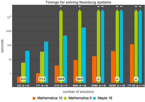 O Mathematica 10 inclui uma nova ferramenta de solução de polinômios numéricos baseada em homotopia. Esse método é automaticamente selecionado quando apropriado. Os gráficos a seguir comparam o tempo de espera desse novo algoritmo com o método de Base Gröbner do Mathematica 9 e com o mais rápido dos 18 comandos solve ou Homotopy do Maple 18. Todos os testes foram conduzidos em um sistema Linux de 64 bits, 2.40 GHz e 16 núcleos, com a tecnologia Hyper-Threading habilitada e um limite de tempo de 12 horas.