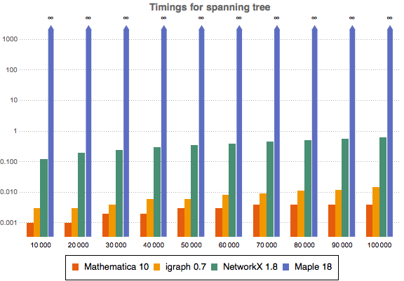 Compare timings for computing spanning trees for graphs. Experiments were performed on an Intel Core i7 2.93 GHz Windows 7 system, with a time limit of 1000 seconds.