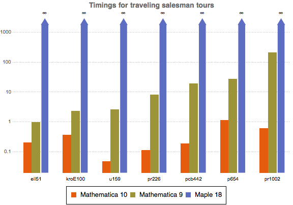 Compare los tiempos para computar vendedor viajeros para gráficos. Se realizaron experimentos en un sistema Intel Core i7 3.07 GHz Windows 7, con un límite de tiempo de 1000 segundos.
