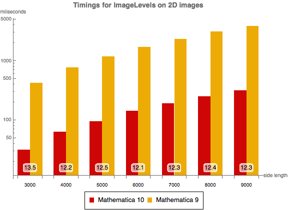 Los tiempos para la computación de niveles de imagen en Mathematica 10 y Mathematica 9 como la función de longitud de lado. El experiemento fue realizado en un sistema Windows 7 de 64-bits equipado con 2 x Intel Xeon E5620 @ 2.40 GHz CPU. El número en la parte inferior muestra cuán más rápido Mathematica 10 es comparado con Mathematica 9.