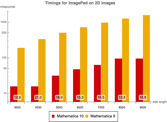 Los tiempos para rellenar imágenes en Mathematica 10 y Mathematica 9 como la función de longitud de lado. El experimento fue realizado en un sistema Windows 7 de 64-bits equipado con 2 x Intel Xeon E5620 @ 2.40 GHz CPU. El número en la parte inferior muestra cuán más rápido Mathematica 10 es comparado con Mathematica 9.
