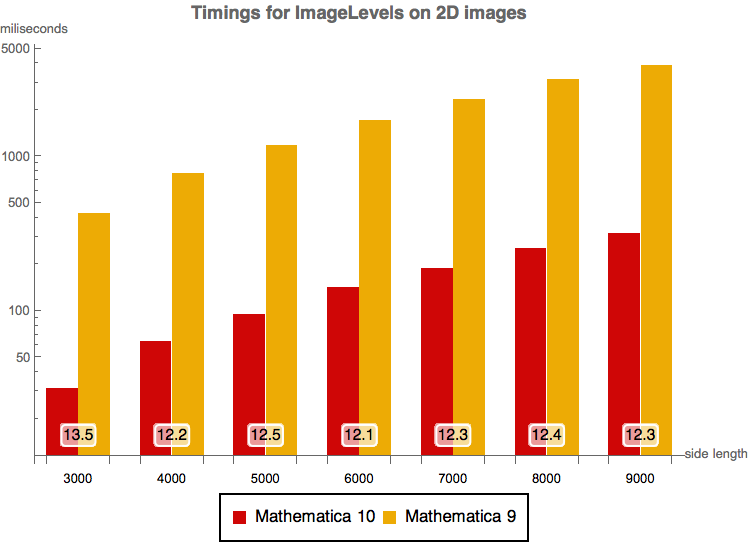 将 Mathematica 10 和 Mathematica 9 的图像等级的计算时间作为边长函数. 试验在配备 2 x Intel Xeon E5620 @ 2.40 GHz CPU 的 64 位 Windows 7 系统中进行. 图像底部的数字显示了 Mathematica 10 比 Mathematica 9 快多少.