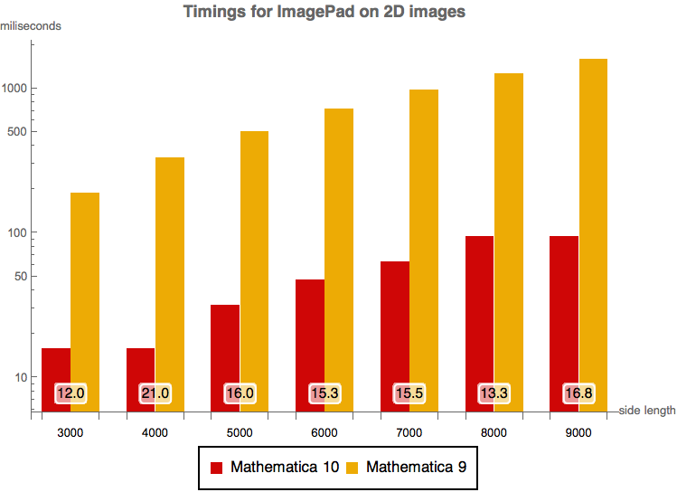 将 Mathematica 10 和 Mathematica 9 的填充图像时间作为边长函数. 试验在配备 2 x Intel Xeon E5620 @ 2.40 GHz CPU 的 64 位 Windows 7 系统中进行. 图像底部的数字显示了 Mathematica 10 比 Mathematica 9 快多少.