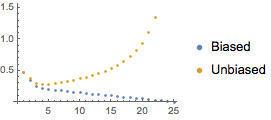 A integração aprimorada para processos aleatóreos e os frameworks de estatística e probabilidade do Mathematica 10 permitem computação simbólica com muitas fatias de um processo. Em particular, esse exemplo investiga dois estimadores da função de autocorrelação absoluta e explora as trocas entre o viés do estimador e sua variância de população.