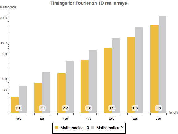 Die Zeit, die zur Berechnung diskreter Fourier-Transformationen in Mathematica 10 und Mathematica 9 benötigt wird, ist hier als Längenfunktion dargestellt. Das Experiment wurde auf einem 64-bit Windows 7-System mit zwei Intel Xeon E5620 @ 2,40 GHz-Prozessoren durchgeführt. Die Zahlen unter der x-Achse geben an, wie viel schneller die Berechnung mit Mathematica 10 gegenüber Mathematica 9 ist.