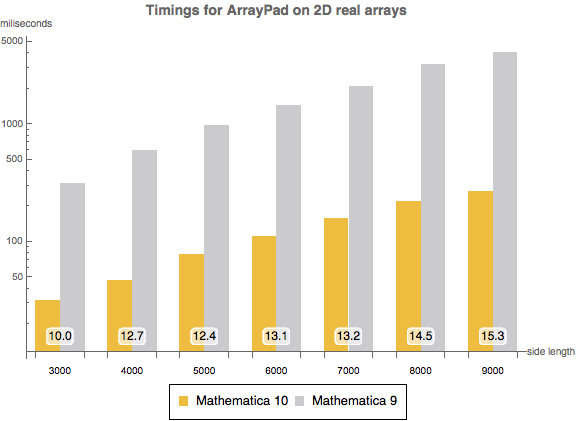Die Zeit, die für das Padding von zweidimensionalen Arrays in Mathematica 10 und Mathematica 9 benötigt wird, ist hier als Längenfunktion dargestellt. Das Experiment wurde auf einem 64-bit Windows 7-System mit zwei Intel Xeon E5620 @ 2,40 GHz-Prozessoren durchgeführt. Die Zahlen unter der x-Achse geben an, wie viel schneller Mathematica 10 gegenüber Mathematica 9 ist..