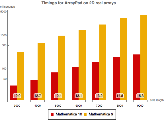 Los tiempos para rellenar matrices en 2D en Mathematica 10 y Mathematica 9 como una función de longitud. El experimento fue realizado en un sistema Windows 7 de 64 bits equipado con 2 x Intel Xeon E5620 @ 2.40 GHz CPU. El número en la parte inferior muestra cuán más rápido es Mathematica 10 comparado con Mathematica 9.