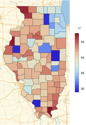 イリノイ州の各郡における年齢の中央値をプロットする.