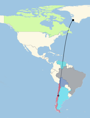 Ermitteln Sie eine Liste der Länder, die auf der geodätischen Linie zwischen Santiago de Chile in Chile und Nuuk in Grönland liegen.