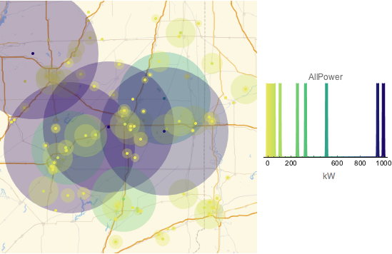 Markieren Sie jede Station mit ihrem Senderadius. Der Radius ist proportional zur Quadratwurzel der Rundfunksübertragung.