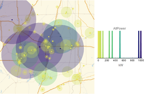 各放送局とその視聴半径を示す.半径は放送電力の二乗根に比例する.