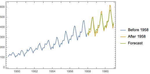将1958年到1961年的预测与实际数据进行对比.