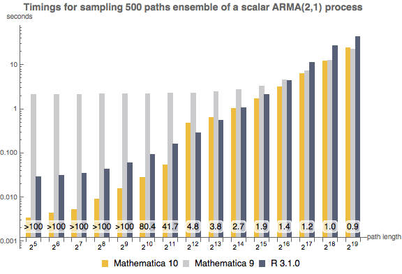 Tempos de espera para amostrar o conjunto de 500 caminhos de um processo ARMA(2,1) escalar no Mathematica 10, Mathematica 9, e em R 3.1.0 em função do comprimento do caminho. O experimento foi realizado em um sistema Windows de 64 bits equipado com Intel Core i7 2.93 GHz. O número na parte inferior mostra o quão mais rápido é o Mathematica 10 em relação ao Mathematica 9.