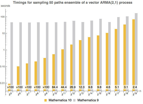 Tempos de espera para amostrar o conjunto de 50 caminhos de um processo ARMA(2,1) vetorial de duas dimensões no Mathematica 10 e no Mathematica 9 em função do comprimento do caminho. O experimento foi realizado em um sistema Linux de 64 bits equipado com Intel Xeon 3.07 GHz. O número na parte inferior mostra o quão mais rápido é o Mathematica 10 em relação ao Mathematica 9.