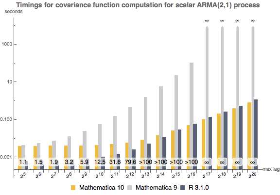Tempos de espera para computar uma sequência de autocovariância de um processo ARMA(2,1) escalar no Mathematica 10, Mathematica 9, e em R 3.1.0 em função do atraso máximo. O experimento foi realizado em um sistema Windows de 64 bits equipado com Intel Core i7 2.93 GHz, com tempo limite de 120 segundos. O número na parte inferior mostra quão mais rápido é o Mathematica 10 em relação ao Mathematica 9.