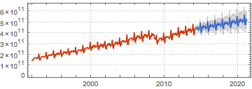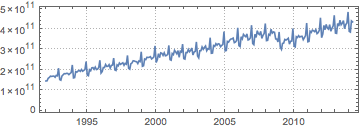 アメリカ国内における,季節変動未修正の額面通りの毎月の小売り売上高をインポートする.