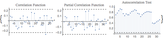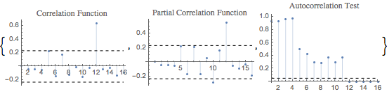 自己相関,偏自己相関,リュング・ボックスのプロットは,遅れ12における相関を示唆する.