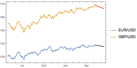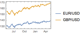 Los tipos de cambio de euros a dólares de libra esterlinas a dólares como una series temporal vectorial.