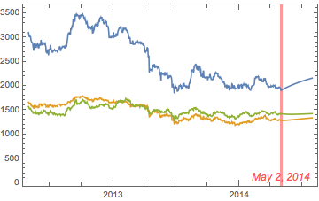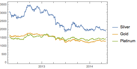Die Preise von Edelmetallen sind stark korreliert. Analysieren Sie die Preisvektoren von Silber, Gold und Platin zwischen dem 1. Mai 2012 und dem 1. Mai 2014. Die Silberpreise werden mit 100 multipliziert.