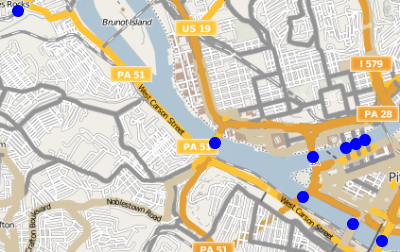 Stellen Sie die Brücken im Zentrum von Pittsburgh mit Tooltips, die Bilder anzeigen, dar.