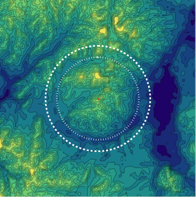 Stellen Sie einen wahrscheinlichen Einschlagkrater in der Demokratischen Republik Kongo mit einer stark kontrastierten Höhenlinienkarte dar. Visualisieren Sie den Umfang des Kraters.