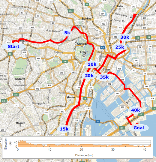 Muestre la trayectoria de la maratón de Tokyo y cambie la elevación a lo largo de la ruta.