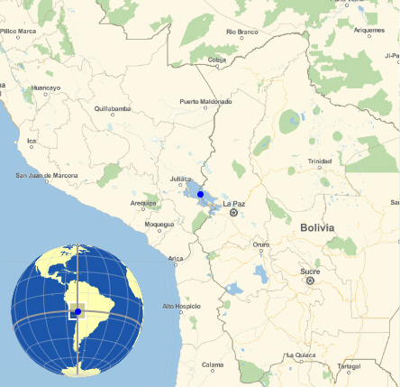 Visualize a área ao redor do Lago Titicaca tanto em um mapa local quanto em um mundial.