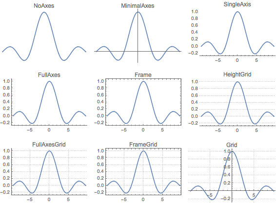 Los ejes y rejillas son usualmente elementos de visualización ignorados. Elija estilos que van desde sin ejes hasta un marco con rejillas. Un eje único y altura de rejilla de aspecto moderno están incluidos.