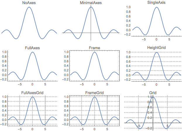 轴和网格是经常被忽视的可视化元素. 从没有轴到有网格的框架选择样式. 其中包括新型外观的单轴和高度网格.
