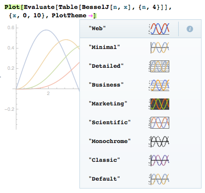 プロットテーマのオプション値補完メニューは,各テーマがどのように見えるかをアイコンで例示する.