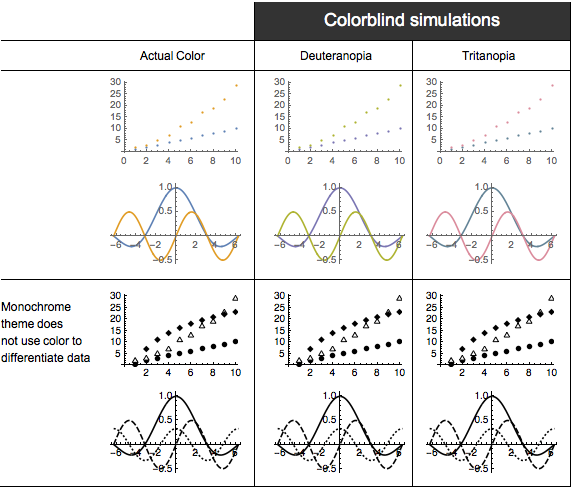 男性のおおよそ8%と女性のおおよそ0.5%が何らかの色覚異常を持っている.デフォルトテーマの最初の2色は,広い範囲の人がはっきり区別できるよう選ばれている.Monochromeテーマは,多数のデータ集合ををプロットする際に,データグループが区別できるよう破線やユニークな点の形を持つ単色の要素からできている.
