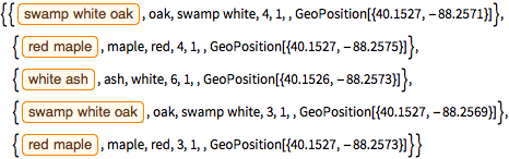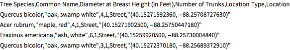 Aqui estão as primeiras entradas em um arquivo de dados de árvores para a cidade de Champaign, Illinois.