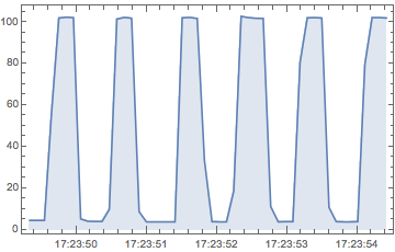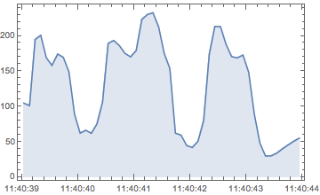 以下是从 Tinker Forge Weather Station 读取照明数据生成的时间序列,在不断改变设备方向的同时,以0.1秒为间隔共读取5秒钟.