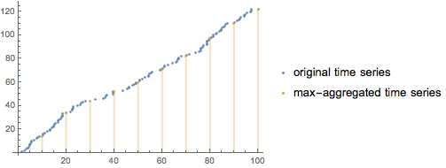 Use TimeSeriesAggregate to build regularly spaced time series of the largest values in non-overlapping windows of constant width.