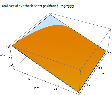 synth[a_, b_] := Block[{tab, lower, upper, pricec = FinancialDerivative[{"American", "Call"}, a, b, "Value"], pricep = FinancialDerivative[{"American", "Put"}, a, b, "Value"], deltac = FinancialDerivative[{"American", "Call"}, a, b, "Delta"], deltap = FinancialDerivative[{"American", "Put"}, a, b, "Delta"], gammac = FinancialDerivative[{"American", "Call"}, a, b, "Gamma"], gammap = FinancialDerivative[{"American", "Put"}, a, b, "Gamma"], qcall, qput, myParabolicApproximation, underlyingprice = "CurrentPrice" /. b, strikeprice = "StrikePrice" /. a, volatility = "Volatility" /. b, timetoexpiry = "Expiration" /. a, underlyingrange}, underlyingrange[number_] := underlyingprice + number*underlyingprice*volatility*Sqrt[timetoexpiry]; lower = underlyingprice - 1.5*strikeprice*volatility*Sqrt[timetoexpiry]; upper = underlyingprice + 1.5*strikeprice*volatility*Sqrt[timetoexpiry]; {qcall, qput} = {qc, qp} /. Flatten@Solve[-qc deltac + qp deltap == -1. && -qc gammac + qp gammap == 0, {qc, qp}]; tab = Transpose@ Flatten[Table[{{val, time, underlyingprice - val}, {val, time, qput (FinancialDerivative[{"American", "Put"}, a /. _["Expiration", _] :> Rule["Expiration", time], b /. _["CurrentPrice", _] :> Rule["CurrentPrice", val], "Value"] - pricep) - qcall (FinancialDerivative[{"American", "Call"}, a /. _["Expiration", _] :> Rule["Expiration", time], b /. _["CurrentPrice", _] :> Rule["CurrentPrice", val], "Value"] - pricec)}}, {val, lower, upper, (upper - lower)/81}, {time, "Expiration" /. a, ("Expiration" /. a)/ 2, -("Expiration" /. a)/40}], 1]; Column[{Spacer[30], Style["Total cost of synthetic short position: $" <> ToString[ qput pricep - qcall pricec], FontFamily -> "Georgia"], Spacer[30], ListPlot3D[tab, AxesLabel -> {"price", "time", "value"}, AxesOrigin -> {lower, 0}, ImageSize -> 425, Mesh -> None, PlotStyle -> {Directive[Orange, Specularity[White, 40]], Directive[LightBlue]}]}]]; synth[ {"StrikePrice" -> 40.00, "Expiration" -> 1, "Value" -> 13}, {"InterestRate" -> 0.01, "CurrentPrice" -> 50, "Dividend" -> 0.05, "Volatility" -> 0.40}]