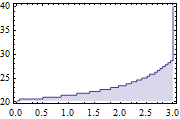 ListPlot[{#, FinancialDerivative[{"American", "Put"}, {"StrikePrice" -> 40.00, "Expiration" -> 3}, {"InterestRate" -> EffectiveInterest[.05, 0], "Volatility" -> 0.26, "CurrentPrice" -> FinancialData["MSFT"], "Dividend" -> 0.07, "ReferenceTime" -> #}, "CriticalValue", "GridSize" -> {1000, 50}]} & /@ Range[0, 3, 0.05], Joined -> True, InterpolationOrder -> 0, Filling -> Bottom, Axes -> False, Frame -> True, PlotRange -> All]