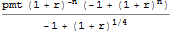 TimeValue[Annuity[pmt, n, 1/4], r, 0]