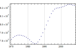 DateListPlot[\!\(\* NamespaceBox["LinguisticAssistant", DynamicModuleBox[{WolframAlphaClient`Private`query$$ = "population history of germany", WolframAlphaClient`Private`boxes$$ = RowBox[{"CountryData", "[", RowBox[{"\"Germany\"", ",", " ", RowBox[{"{", RowBox[{"\"Population\"", ",", " ", "All"}], "}"}]}], "]"}], WolframAlphaClient`Private`allassumptions$$ = {}, WolframAlphaClient`Private`assumptions$$ = {}, WolframAlphaClient`Private`open$$ = {1, 2}}, DynamicBox[ToBoxes[ AlphaIntegration`LinguisticAssistantBoxes["", 1, Dynamic[WolframAlphaClient`Private`query$$], Dynamic[WolframAlphaClient`Private`boxes$$], Dynamic[WolframAlphaClient`Private`allassumptions$$], Dynamic[WolframAlphaClient`Private`assumptions$$], Dynamic[WolframAlphaClient`Private`open$$]], StandardForm], ImageSizeCache->{337., {25., 30.}}], DynamicModuleValues:>{}], BaseStyle->{Deployed -> True}, DeleteWithContents->True, Editable->False, SelectWithContents->True]\)]