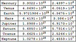 Grid[Transpose[{\!\(\* NamespaceBox["LinguisticAssistant", DynamicModuleBox[{WolframAlphaClient`Private`query$$ = "planets", WolframAlphaClient`Private`boxes$$ = RowBox[{"AstronomicalData", "[", "\"Planet\"", "]"}], WolframAlphaClient`Private`allassumptions$$ = {{ "type" -> "Clash", "word" -> "planets", "count" -> "3", "Values" -> {{ "name" -> "AstronomicalClass", "desc" -> "a class of astronomical objects", "input" -> "*C.planets-_*AstronomicalClass-"}, { "name" -> "ExamplePage", "desc" -> "a general topic", "input" -> "*C.planets-_*ExamplePage-"}, { "name" -> "Word", "desc" -> "a word", "input" -> "*C.planets-_*Word-"}}}}, WolframAlphaClient`Private`assumptions$$ = {}, WolframAlphaClient`Private`open$$ = {1, 2}}, DynamicBox[ToBoxes[ AlphaIntegration`LinguisticAssistantBoxes["", 1, Dynamic[WolframAlphaClient`Private`query$$], Dynamic[WolframAlphaClient`Private`boxes$$], Dynamic[WolframAlphaClient`Private`allassumptions$$], Dynamic[WolframAlphaClient`Private`assumptions$$], Dynamic[WolframAlphaClient`Private`open$$]], StandardForm], ImageSizeCache->{218., {26., 31.}}], DynamicModuleValues:>{}], BaseStyle->{Deployed -> True}, DeleteWithContents->True, Editable->False, SelectWithContents->True]\), \!\(\* NamespaceBox["LinguisticAssistant", DynamicModuleBox[{WolframAlphaClient`Private`query$$ = "planet mass", WolframAlphaClient`Private`boxes$$ = RowBox[{"AstronomicalData", "[", RowBox[{"\"Planet\"", ",", " ", "\"Mass\""}], "]"}], WolframAlphaClient`Private`allassumptions$$ = {}, WolframAlphaClient`Private`assumptions$$ = {}, WolframAlphaClient`Private`open$$ = {1, 2}}, DynamicBox[ToBoxes[ AlphaIntegration`LinguisticAssistantBoxes["", 1, Dynamic[WolframAlphaClient`Private`query$$], Dynamic[WolframAlphaClient`Private`boxes$$], Dynamic[WolframAlphaClient`Private`allassumptions$$], Dynamic[WolframAlphaClient`Private`assumptions$$], Dynamic[WolframAlphaClient`Private`open$$]], StandardForm], ImageSizeCache->{275., {25., 30.}}], DynamicModuleValues:>{}], BaseStyle->{Deployed -> True}, DeleteWithContents->True, Editable->False, SelectWithContents->True]\), \!\(\* NamespaceBox["LinguisticAssistant", DynamicModuleBox[{WolframAlphaClient`Private`query$$ = "planet radius", WolframAlphaClient`Private`boxes$$ = RowBox[{"AstronomicalData", "[", RowBox[{"\"Planet\"", ",", " ", "\"Radius\""}], "]"}], WolframAlphaClient`Private`allassumptions$$ = {}, WolframAlphaClient`Private`assumptions$$ = {}, WolframAlphaClient`Private`open$$ = {1, 2}}, DynamicBox[ToBoxes[ AlphaIntegration`LinguisticAssistantBoxes["", 1, Dynamic[WolframAlphaClient`Private`query$$], Dynamic[WolframAlphaClient`Private`boxes$$], Dynamic[WolframAlphaClient`Private`allassumptions$$], Dynamic[WolframAlphaClient`Private`assumptions$$], Dynamic[WolframAlphaClient`Private`open$$]], StandardForm], ImageSizeCache->{288., {25., 30.}}], DynamicModuleValues:>{}], BaseStyle->{Deployed -> True}, DeleteWithContents->True, Editable->False, SelectWithContents->True]\)}], Frame -> All]
