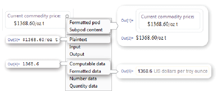 Представление результатов в стиле Wolfram|Alpha содержит меню для выделения результатов для дальнейших расчётов или отображения. Выбор пункта меню создает строку ввода, содержащую соответствующее выражение WolframAlpha. Данные можно извлекать в виде форматированного пода, простого текста, данных пригодных для вычислений, в виде временного ряда, пригодного для построения графика.