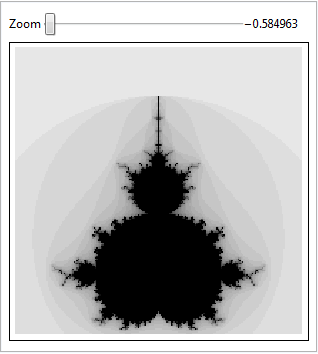 mandelComp = Compile[{{c, _Complex}}, Module[{num = 1}, FixedPoint[(num++; #^2 + c) &, 0, 30, SameTest -> (Re[#]^2 + Im[#]^2 >= 4 &)]; num], CompilationTarget -> "C", RuntimeAttributes -> {Listable}, Parallelization -> True]; doPlotDrag[{x_, y_}] := Panel[ DynamicModule[{dragstart = {0, 0}, dragval = {0, 0}, draghold = {x, y}, xrange, yrange, m = -Log[2, 1.5], scale = 1.5}, Column[{ Row[{"Zoom ", Slider[Dynamic[m, Function[scale = 2.^-#; m = #]], {-1, 50}], Dynamic[m]}], EventHandler[ Dynamic[{xshift, yshift} = (dragstart - dragval + draghold) {1, -1}; {ylo, yhi} = yshift + scale*{-1, 1}; {xlo, xhi} = xshift + scale*{-1, 1}; xrange = {b, xlo, xhi, .01 scale}; yrange = {a, ylo, yhi, .01*scale}; data = Table[a + I b, Evaluate[yrange], Evaluate[xrange]]; ArrayPlot[mandelComp[data], ImageSize -> 300]], "MouseDown" :> (dragval = dragstart = scale*MousePosition["GraphicsScaled"]), "MouseDragged" :> (dragval = scale*MousePosition["GraphicsScaled"]), "MouseUp" :> (draghold = draghold + dragstart - dragval; dragstart = dragval = {0, 0})]}]] ] doPlotDrag[{0, 1}]