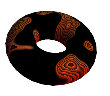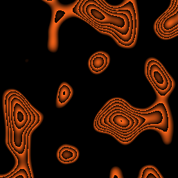 amplitude = 0.5; frequency = 1.0; gain = 0.5; lacunarity = 0.5; scale = 50.0; increment = 5.0; data = 20.0*perlin[256, 256]; img = ImageRecolor[data - Map[IntegerPart, data, Infinity], 1.0, 0.4, 0.1]