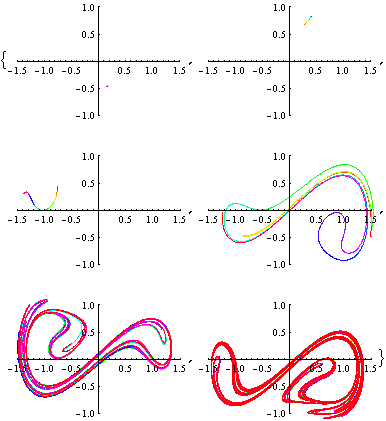 advancelf = LibraryFunctionLoad["demo_numerical", "duffing_crk4", {{Real, _}, Real, Real}, {Real, _}]; refinelf = LibraryFunctionLoad["demo_numerical", "refine", {Real, {Real, 2}}, {Real, 2}]; v = {{0., 0.01}, {0., 0.}}; dist = 0.025; \[CapitalDelta]t = 0.1; \[CapitalDelta]T = 1.0; Tend = 60; plots = Table[ Do[v = advancelf[refinelf[dist, v], t - \[CapitalDelta]t, t], {t, T - 1 + \[CapitalDelta]t, T, \[CapitalDelta]t}]; points = Transpose[v]; Graphics[ Line[points, VertexColors -> Map[Hue, N[Range[Length[points]]]/Length[points]]], Axes -> True, PlotRange -> {{-1.5, 1.5}, {-1, 1}}], {T, \[CapitalDelta]T, Tend, \[CapitalDelta]T }];