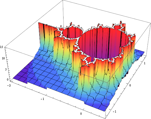 mlf = LibraryFunctionLoad["demo_numerical", "mandelbrot", {Complex}, Integer]; Plot3D[mlf[x + I y], {x, -2., .5}, {y, -1.25, 1.25}, PlotPoints -> 100, ColorFunction -> "Rainbow"]