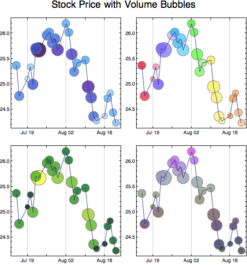 Labeled[Grid[ Partition[ Table[DateListPlot[Transpose[{date, close}], Joined -> True, Prolog -> First[bubble[colorf]], ImageSize -> 250, AspectRatio -> 1, PlotRangePadding -> Scaled[0.05], BaseStyle -> {FontFamily -> "Helvetica"}], {colorf, {(ColorData["DeepSeaColors"][ 1 - #3] &), (ColorData["BrightBands"][#1] &), (ColorData[ "AvocadoColors"][#3] &), (ColorData[ "AuroraColors"][#2] &)}}], 2]], Style["Stock Price with Volume Bubbles", 20, FontFamily -> "Helvetica"], Top]