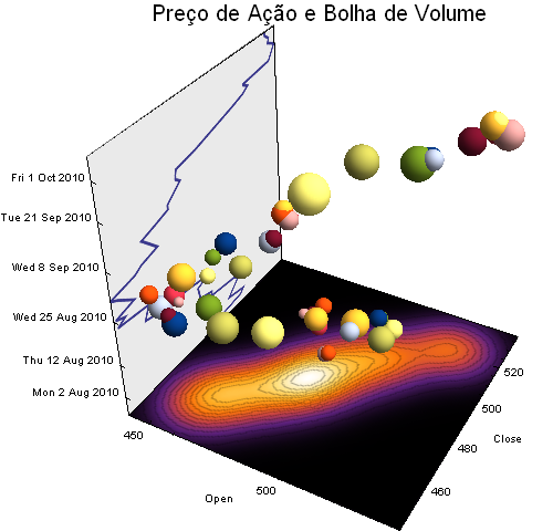 Crie um gráfico com preços em formas de bolhas de volume com distribuição de preços de abertura e fechamento, e um diagrama de densidade de datas marcadas nas laterais.