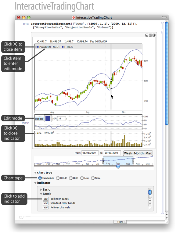 Cree gráficos de operaciones que permiten que pueda variarse el rango de fechas y que se pueda añadir, remover y adaptar indicadores interactivamente.
