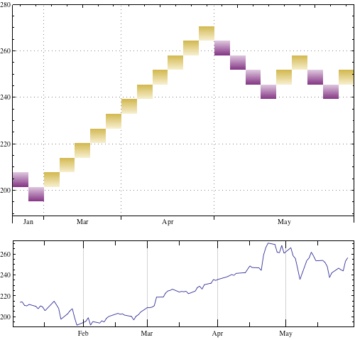 Column[{RenkoChart[data, 0.08, ImageSize -> 500, Axes -> {True, False}, Frame -> {{True, True}, {False, True}}, TrendStyle -> "PurpleGold", ChartElementFunction -> "FadingRectangle"], DateListPlot[data, AspectRatio -> 1/4, ImageSize -> 500, Joined -> True]}]
