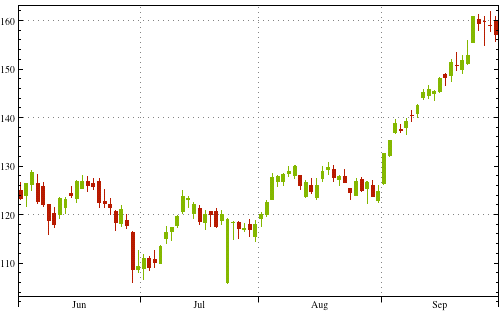 CandlestickChart[{"AMZN", {{2010, 6, 1}, {2010, 9, 30}}}, Frame -> {Left, Right, Top}, FrameTicks -> {{True, True}, {False, False}}, Axes -> {True, False}, PlotRangePadding -> {None, Automatic}]