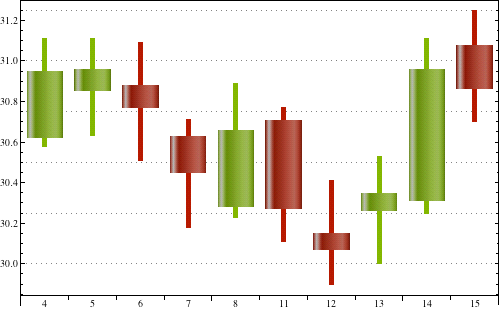 data = FinancialData["MSFT", "OHLC", {{2010, 1}, {2010, 1, 15}}];